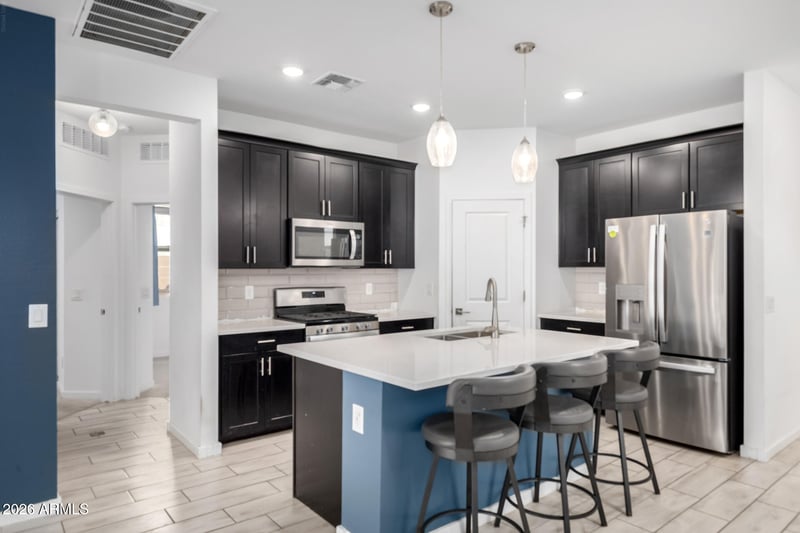 Listing details for 13466 142nd Dr, Surprise, AZ 85379 : This beautifully maintained 3-bedroom home sits on a premium corner lot with standout curb appeal and full turf front and back for year-round green with minimal upkeep. Inside, enjoy a bright open great room with wood-look tile and a stunning kitchen featuring black shaker cabinets, quartz countertops, stainless steel appliances, and a large island perfect for gathering. The primary suite offers dual sinks, a walk-in closet, tile shower, and private water closet. Relax outdoors under the covered patio with roll-down shades, fan, and pavers. An oversized 2-car garage with built-in cabinetry adds exceptional storage. Near-new 50-gal water heater & softener. Located in Marley Park with scenic parks, walking paths, and a beautiful community clubhouse. Your DREAM starts here.