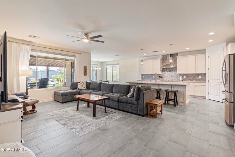 bedrooms, and a flex room that is perfect for a home office. Upgraded tile throughout the main living areas, and a beautiful kitchen, with quartz countertops, gorgeous backsplash, and upgraded appliances. The primary bathroom has an extended walk-in shower, and a massive closet. A three-car tandem garage is connected to an RV garage which is extended 12 feet and is fully air conditioned. The guest home is a must see; upgraded appliances and is located in the fully designed backyard.