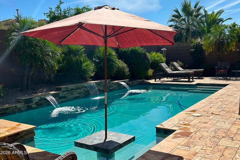 Listing details for 13639 176th Ln, Goodyear, AZ 85338 : Make a Splash in your very own Heated Pool & Spa! Situated in the highly desirable Estrella Mountain Ranch community featuring two state of the art clubhouses & Golf! Enjoy a spacious floorplan & nicely manicured lush landscaped yard while you lounge by the pool. Original Owners gently used as a second home & ready for new owners. Features; New exterior paint, a Heated Pool & Spa with water fall design features, pebble-tech, lighting, $70,000 in upgrades including impressive travertine deck, Great Room, kitchen island including all kitchen appliances, laundry room, washer dryer, large primary suite, walk in closet, flexible 4th bedroom is ideal as a home office/den, 2 baths with dual vanities, 3 car garage, covered back patio. All Furniture is available on separate bill of sale if desired.