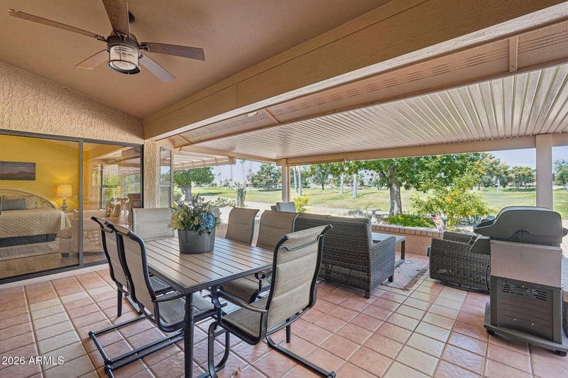 Listing details for 13660 Greenview Dr, Sun City West, AZ 85375 : Fantastic, fully updated Aspen floor plan on Echo Mesa Golf Course with mountain views--ready for its new owner. This 1,866 sq ft home features soaring vaulted ceilings, granite countertops, tiled shower/tub surround, and dual sinks in the primary suite. 2018 A/C with electrostatic filter. Formal dining with bay window, plus family room with slider to extended patio and pergola with golf course views. Great room with eat-in kitchen, breakfast bar, built-in desk, and bookcase. Bonus room ideal for office or hobbies. Huge primary bedroom offers bay window and a third way to access the patio. Garage with cabinets, workbench, and utility sink. Enjoy Sun City West amenities.