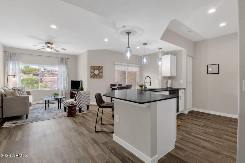 Inside, the open layout makes everyday living feel effortless. The main living area features wood-style flooring, neutral tones, and plenty of natural light. The kitchen is both stylish and functional, with white shaker cabinets, dark countertops, stainless steel appliances, and a breakfast bar that's perfect for quick meals or catching up with friends. Sliding glass doors lead out to a covered balcony where you can relax and take in the desert views. The primary bedroom offers a comfortable retreat with soft carpeting, a ceiling fan, good closet space, and its own en-suite bath. The second bedroom and full bathroom give you flexibility for guests, a home office, or whatever fits your lifestyle. You'll also appreciate the in-unit washer and dryer, extra storage, and the convenience of carport or attached garage parking.