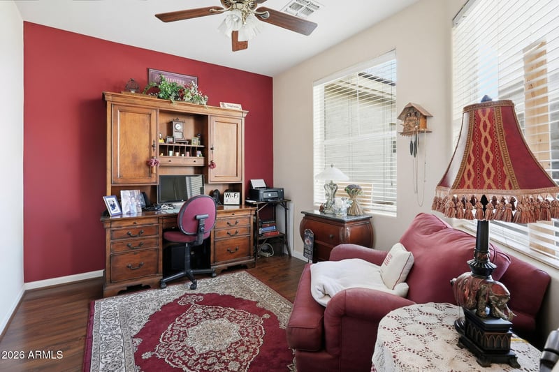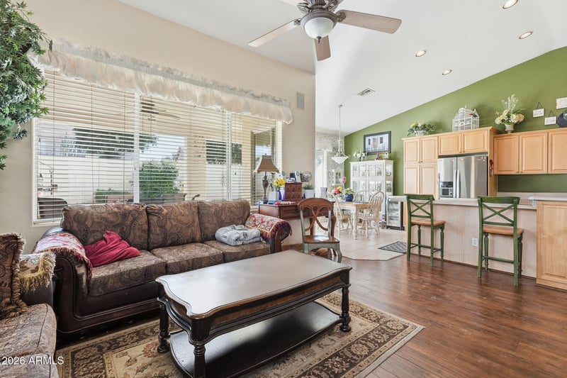 Listing details for 1381 Maplewood St, Chandler, AZ 85286 : Welcome to this beautifully maintained 3-bedroom, 2-bathroom home with a versatile den, offering space, comfort, and an ideal layout for both everyday living and entertaining. From the moment you arrive, you'll appreciate the great curb appeal, highlighted by lush green grass and a welcoming exterior. The widened 2-car garage provides extra functionality with storage cabinets and dedicated workbench space, perfect for projects and organization. Inside, the home features two distinct living areas. The formal living room flows seamlessly into a dining area, while the expansive great room opens to the kitchen and serves as the heart of the home. The great room is enhanced by a built-in entertainment center with in-wall speakers, creating an inviting space for movie nights or gatherings. Newer custom wood flooring adds warmth and style to both living areas, complemented by an abundance of natural light throughout. The kitchen is well-appointed with a gas stove and oven, stainless steel appliances, a center island, ample cabinet space, and a cozy breakfast nook, making it as functional as it is inviting. The spacious primary suite offers a private retreat, complete with a sitting area, walk-in closet, and a well-designed ensuite bathroom featuring a dual-sink vanity with plenty of storage, a walk-in shower, and a relaxing garden jacuzzi bathtub.