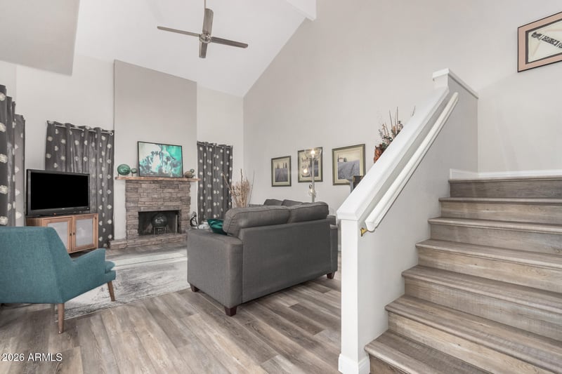 Listing details for 13824 42nd Pl, Phoenix, AZ 85044 : Modern, updated 2-bedroom townhome featuring vaulted ceilings and open living spaces that create an inviting, airy atmosphere. A landing area at the top of the stairs adds extra flexibility for storage or a reading nook. The kitchen offers a hi-top breakfast bar, stainless steel appliances, and a charming eating nook. The spacious primary suite includes room for a reading corner and a spa-like bathroom with an oversized walk-in shower. Enjoy a quaint private patio ideal for unwinding, plus a 2-car garage with attached cabinetry for extra storage. A stylish, low-maintenance home designed for comfort and convenience.