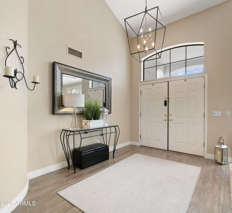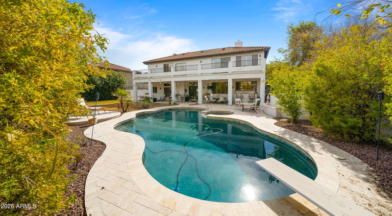 Listing details for 1390 Horseshoe Dr, Chandler, AZ 85249 : Stunning, meticulously maintained 5-bedroom, 3.5-bath home with a 4-car garage on a prime N/S corner lot in the gated Symphony 2 community in Chandler. This beautifully remodeled property features custom wood shutters throughout home, an open-concept floorplan and a true entertainer's kitchen with quartz countertops, built-in appliances and a resort-style backyard. The spacious kitchen opens seamlessly to the oversized family room and bar that is perfect for hosting. A formal dining room and expansive formal living area with a beautiful fireplace provide additional space for gatherings. Upstairs offers four generous bedrooms in a desirable split layout, plus a second upstairs family/entertainment room ideal for a game room, playroom, or fitness area.... The massive primary suite has a two-way gas fireplace, separate tub and large shower. Also a walkout deck. A private bedroom ensuite downstairs is perfect for guests. Enjoy beautifully matured landscape front and backyards, a full upper walkout deck, and an incredibly private backyard that backs to a common area. Outdoor amenities include a PebbleTec diving pool, large grass area and a half sport court, creating the ultimate Arizona outdoor retreat. Ideally located with quick access to the Price Corridor and Chandler's thriving high-tech business hub including Intel, Orbital Science, PayPal, and the Wells Fargo Corporate Center. Minutes to top-rated dining, premier shopping, Chandler Fashion Center, Shoppes at Casa Paloma, Chandler Pavilions, Phoenix Premium Outlets, and the charm of Historic Downtown Chandler. Easy to show don't miss this must-see home!