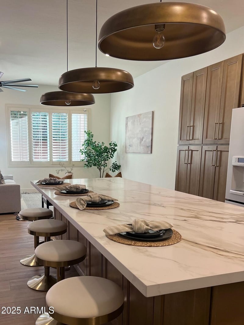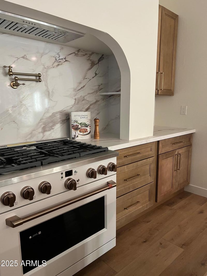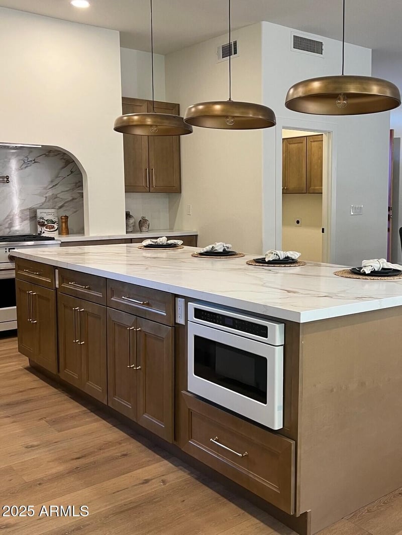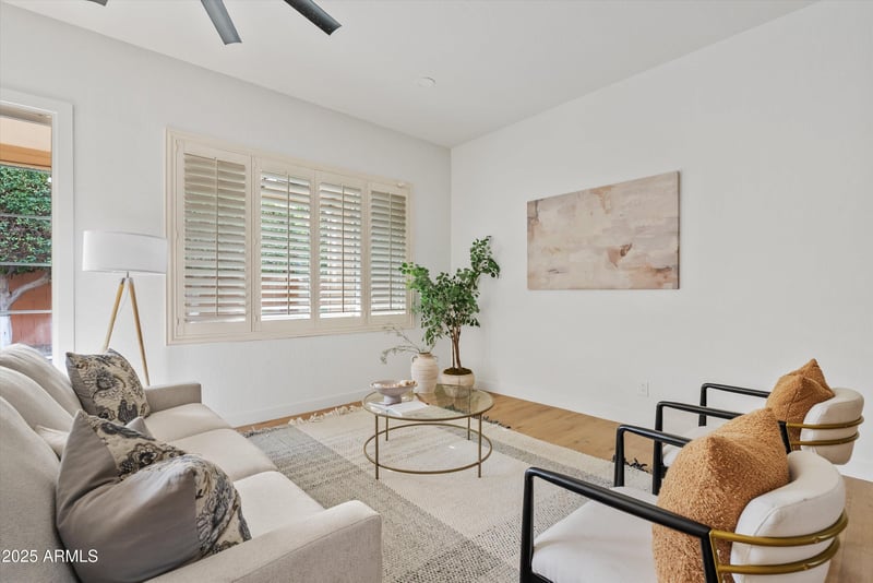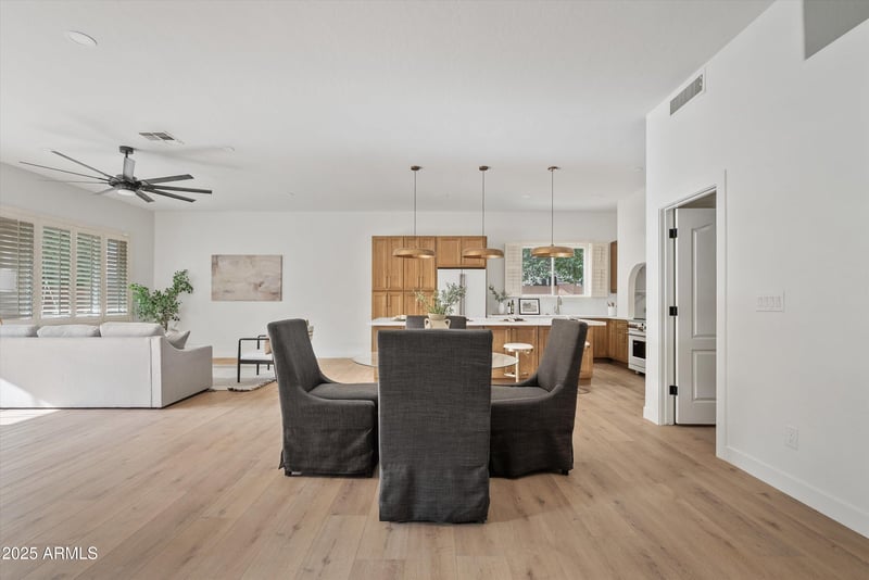 Listing details for 1391 Windhaven Ave, Gilbert, AZ 85233 : This stunning remodeled Gilbert gem combines modern sophistication w/ timeless warmth in The Villages at North Shore. Step inside to a full interior renovation featuring brand-new wood-look alike flooring throughout & a chef-inspired kitchen w/ brand new GE Café appliances (including 36in gas range), an oversized eat-in island w/ built-in microwave, ample cabinet storage, & a show stopping range hood as the centerpiece. The office/den makes a bold statement w/ color-drenched walls & a designer chandelier. The primary suite offers a serene retreat complete w/ a large walk-in closet & a dark walnut dual vanity, complimented by floor to ceiling designer tile & a luxurious walk-in shower w/ waterfall shower head & bench. In the guest bath, checkered tile wraps the tub, paired w/ exposed brass shower plumbing & a spacious dual-sink vanity. Outside, enjoy a covered back patio w/ porch swing, lush turf, & a sparkling pool surrounded by mature citrus trees that create privacy & shade. The garage has built in cabinets for extra storage, direct access from the garage to the side yard & direct entry to the home through the laundry room. The cul-de-sac lot offers peace and quiet just steps from the neighborhood greenbelt, park, & community pool!
