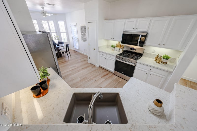 Listing details for 13949 Rico Dr, Sun City West, AZ 85375 : Beautiful golf course community, 3-bedroom, 2-bathroom home that boasts upgrades. New tile floor throughout the house, new baseboard throughout the house. New appliances, new double basin sink, new Quartz kitchen counters, Skylight in kitchen. New ceiling fan in the main bedroom and living room. Garage with custom storage. The exterior offers low-maintenance landscaping, a welcoming secured front patio, and a private backyard.