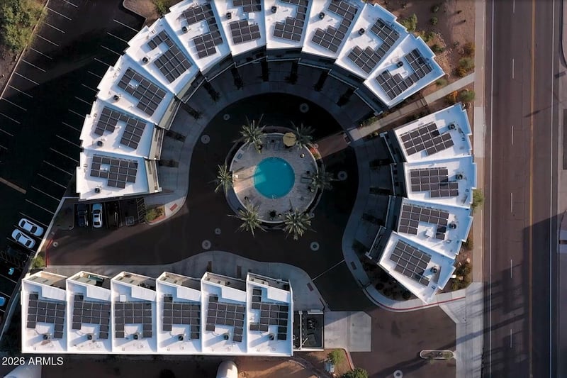 Listing details for 1401 Granite Reef Rd #1019, Scottsdale, AZ 85257 : Circle Lofts is a limited collection of just 20 architecturally striking townhomes designed around a bold and unexpected idea: community as art. Homes are oriented along a graceful arch that embraces the central pool, creating intentional view corridors and a connection to the heart of the community. This plan has three private bedroom suites, one on each level for absolute comfort and separation. Discover livable luxury, featuring floating staircases, unexpected angles, expansive multi-slide doors, soaring two story living space , a private rear yard and carefully curated finishes. A secure gated entry and owned solar complete a community that is as thoughtful as it is visually compelling. Circle Lofts is not just a place to live--it's a state