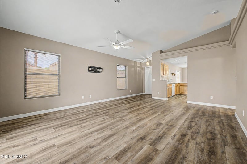 vaulted ceilings, creates flow from the main living area into an eat-in kitchen designed for everyday use. Wood look vinyl runs throughout, delivering easy maintenance. Major system updates include a 2-yr old air conditioner and 1-yr old hot water heater. The backyard opens up with added privacy and space. Access to US-60, White Tank Mountain Regional Park, Lake Pleasant Regional Park, plus Cactus League spring training. Everyday dining, shopping, and essentials are close, making this a practical option for buyers focused on value, location, and livabilit