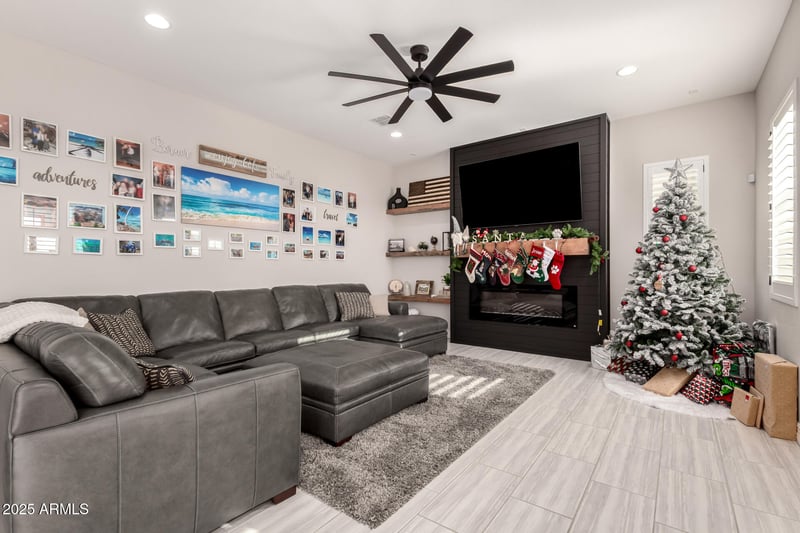 Listing details for 14045 Mariposa Grande --, Surprise, AZ 85387 : Tucked away at the end of a private cul-de-sac in the coveted Surprise community of Rancho Mercado, this stunning like-new residence offers refined modern living with the rare advantage of backing to open space and the scenic Maricopa Trail. Spanning just under 3,000 sq. ft., the thoughtfully designed floor plan features 4 bedrooms plus a spacious loft, 3 bathrooms and exceptional flexibility for today's lifestyle. The main level welcomes you with a private guest suite and full bath, an oversized laundry room and a spacious family room anchored by a cozy fireplace. At the heart of the home, the open-concept kitchen impresses with crisp white cabinetry, stainless steel appliances, granite countertops, subway tile backsplash and a massive island accented by contemporary pendant lighting--perfect for both everyday living and entertaining. Upstairs, an expansive loft/flex space is joined by two guest bedrooms with a full bath, while the luxurious primary retreat showcases a spa-inspired en suite with dual vanities, custom-tiled walk-in shower, jetted tub and an oversized walk-in closet. Completing the home is a tandem three-car garage plus a highly desirable, pull-through RV bay, ideal for hobbies and toys. Step outside to a relaxing covered patio and expansive backyard ready for your personal vision. With its serene cul-de-sac setting, open-space backdrop, an impressive array of builder and owner upgrades throughout the home, and access to community parks/nearby recreation, this move-in-ready home delivers the perfect blend of privacy, luxury, and convenience.