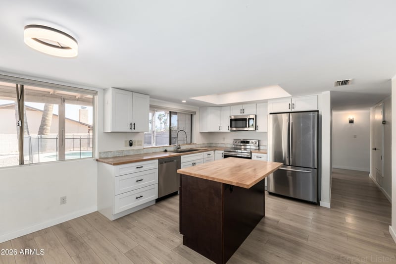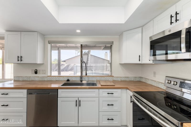 Listing details for 14053 Hampstead Dr, Fountain Hills, AZ 85268 : Welcome to this beautifully remodeled single-level home in Fountain Hills, offering the perfect blend of comfort, style, and Arizona outdoor living. Situated on a spacious lot with mountain views, this move-in ready home features a large fenced backyard complete with a private pool and an expansive covered patio--ideal for relaxing or entertaining. Inside, the updated kitchen showcases white shaker cabinetry, butcher block countertops, and stainless steel appliances, all opening seamlessly to the family room and outdoor living space for effortless indoor-outdoor flow. The family room is anchored by a cozy wood-burning fireplace, creating a warm and inviting atmosphere. In addition to the main living area, the home offers a formal living room and dining room, providing flexible space for gatherings or everyday living. The primary suite is a true retreat, featuring a beautifully updated ensuite bath with a walk-in tile shower, dual sink vanity, and private access to the backyard for easy poolside enjoyment. Luxury vinyl plank flooring runs throughout the home, complemented by upgraded baseboards for a clean, modern finish. The guest bathroom is also nicely remodeled and all bedrooms are generously sized. Start living the relaxed Fountain Hills lifestyle today.