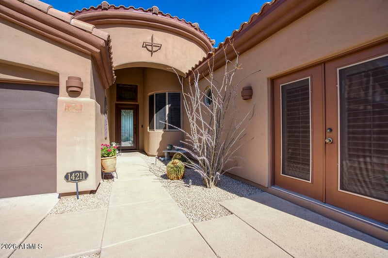 Listing details for 14211 Honeysuckle Dr, Fountain Hills, AZ 85268 : Wow--this luxury, upgraded 4-bedroom Fountain Hills home delivers mountain views, style, and effortless indoor-outdoor living. Upon arrival, a custom iron and glass front door sets a refined first impression. Inside, soaring 12-foot ceilings, an open floor plan, and abundant natural light create an elevated luxury feel. You'll find thoughtful upgrades throughout, including newer kitchen and baths, a new roof (2023), new AC and water heater (2025), custom Pella sliding doors, upgraded shutters, newer interior and exterior paint, and an upgraded travertine patio--making this home truly move-in ready. The designer kitchen has been beautifully remodeled with alder cabinetry, quartz countertops, new appliances, under-cabinet lighting, pull-out drawers, and an R/O system. It opens seamlessly to the informal dining area and family room, where custom Pella sliding doors create easy flow to the backyard. Outside, enjoy the views while relaxing in your resort-style backyard, featuring a covered patio with travertine pavers, a sparkling heated pool and spa, a built-in natural gas BBQ, and easy-maintenance landscaping. The oversized primary suite is a true retreat with private patio access, serene views, and a spa-like luxury bathroom featuring custom cabinetry, quartz counters, a walk-in tile shower, and dual closets. A formal living and dining room provide flexible space to fit your lifestyle. Three additional guest bedrooms and a remodeled guest bath with dual sinks and quartz counters complete the guest wing. Beautifully upgraded luxury living in Sunridge Canyon. Start living the Fountain Hills lifestyle today!