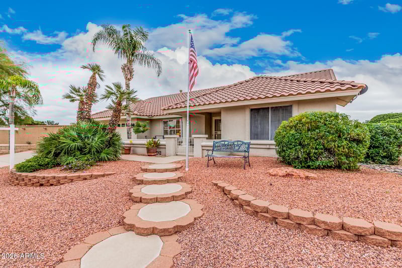 Listing details for 14235 White Rock Dr, Sun City West, AZ 85375 : An open and bright floor plan with a fantastic view of the First Tee Box of the Grandview Golf Course. With this home you will be greeted with an amazing curb appeal and Double Doors. A front patio to enjoy the Arizona Sun. With 18 inch tile in family room and kitchen area clean up is a breeze. Vaulted ceilings in Family Room and Living Room. Granite Countertops in Kitchen with a Bay window to enjoy the view of the golf course. All carpets have been removed and replaced with laminate or wood floors. Freshly painted on the inside to keep the home fresh and bright. If outdoor living is high on your list, look no further. This home features a large screened in back patio with tile floors and built in cabinets with granite countertops. Large Gazebo with fireplace table and oversized backyard.