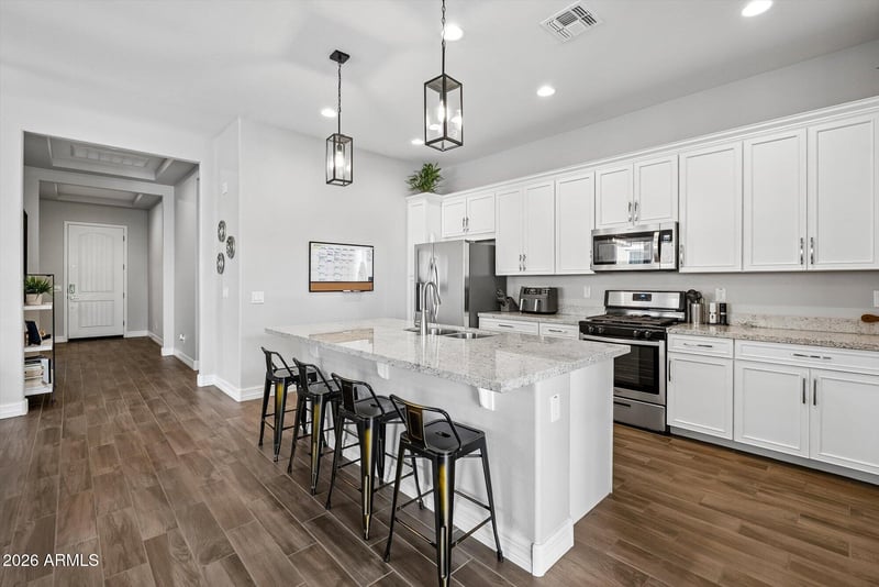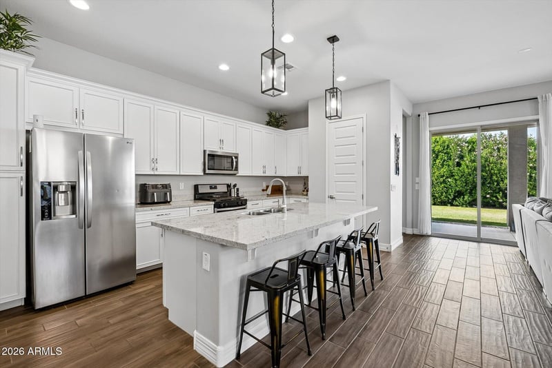 Listing details for 14334 Georgia Dr, Surprise, AZ 85379 : Beautifully upgraded and move-in ready in sought-after Homestead at Marley Park! This bright, open 3 bed, 2 bath home offers 1,760 sq ft, a split primary retreat, and a rare 2.5-car tandem garage. The spa-inspired primary bath features dual shower heads with a rain shower upgrade. Stylish finishes include wood-look tile, granite kitchen counters, upgraded kitchen and bath cabinetry, 5.5-inch baseboards, surround sound pre-wire, plus upgraded paver driveway and front walkway for standout curb appeal. Perfectly located near parks, schools, shopping, dining, and entertainment, this home blends comfort, style, and everyday convenience in one of Surprise's most loved communities.