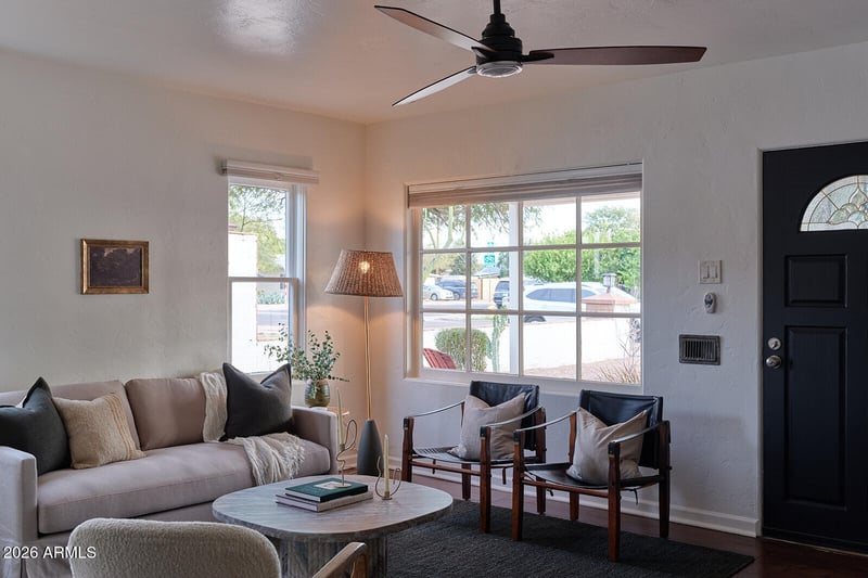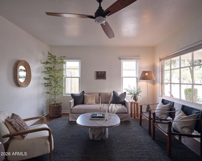 Listing details for 1442 Palm Ln, Phoenix, AZ 85006 : Located in the beloved Historic Coronado Neighborhood of Midtown Phoenix, this 1,413 square foot home sits among tree-lined streets in one of the city's most enduring communities. The three-bedroom, two-bath layout balances original character with thoughtful improvements, including a new HVAC system (2024), water heater (2023), fresh paint (2026), and completely refreshed landscaping in both the front and back yards. Inside, natural light carries through the main living spaces into an updated kitchen with stainless steel appliances and granite countertops. The layout feels intuitive and comfortable, equally suited for quiet evenings at home or hosting. Outside, a covered patio extends the living space, while the desert landscaping offers a low-maintenance backdrop designed for year-round Arizona living. Just minutes from Coronado Park, the shops and restaurants along McDowell's Miracle Mile, and a short bike ride to Roosevelt Row, this home reflects the historic charm, neighborhood pride, and everyday livability that continues to define Midtown Phoenix.