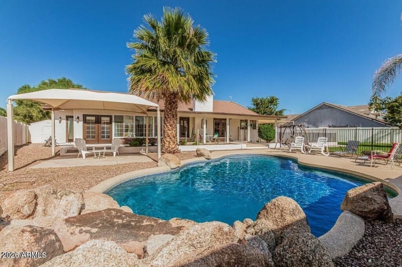 Listing details for 1443 Leland St, Mesa, AZ 85203 : Sanctuary in the Suburbs w/NO HOA! Lodge-feel great room has floor-to-ceiling stone fireplace, view of the backyard oasis. Bright upgraded kitchen- with custom cabinets (slide outs, 2 lazy susans), granite, 2 ovens and room for the family. Spacious primary has remodeled spa-feel bath, 2 walk-ins, sunroom/office with sep. A/C and pool access. BASEMENT: 2200+ sq. ft., new flooring, patio entrance w/ramp, fireplace, huge game space/TV area/gym area, 2 lg. bedrooms w/walk-ins, full bath. . Ample laundry w/built-in storage easily converts to kitchen for poss. 2nd residence. YARD: lawn, trees, garden, fenced heated pool, 3 covered seating/dining areas, and pool bath. 3-car garage w/ custom cabinets. Wide RV gate w/lots of space. Large wooden shed. You have to see this!