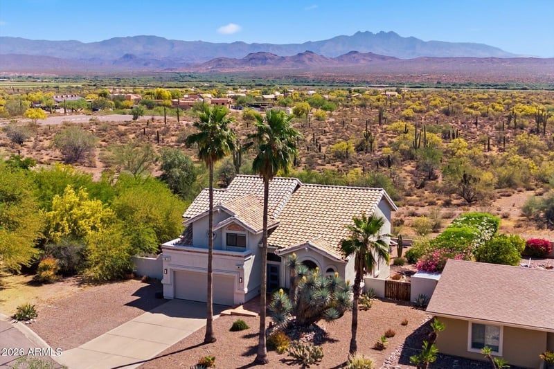 Listing details for 14433 San Carlos Dr, Fountain Hills, AZ 85268 : Amazing Four Peaks and desert views, attractive assumable 3.75% financing, no HOA and the flexibility of a den that easily converts to a third bedroom! Close to Mayo, Basis Schools and airport. Step inside to discover a foyer with vaulted ceilings, open concept living spaces and a gourmet kitchen. The home offers two comfortable bedrooms, with the added versatility of a den that can easily serve as a third bedroom, home office, or creative space. The luxurious primary suite boasts a spa-like en-suite bathroom with natural stone accents and a dual vanity. Enjoy the outdoors from an expansive covered patio and a private oasis, beautifully landscaped with native desert flora backing to the beautiful and peaceful natural desert.