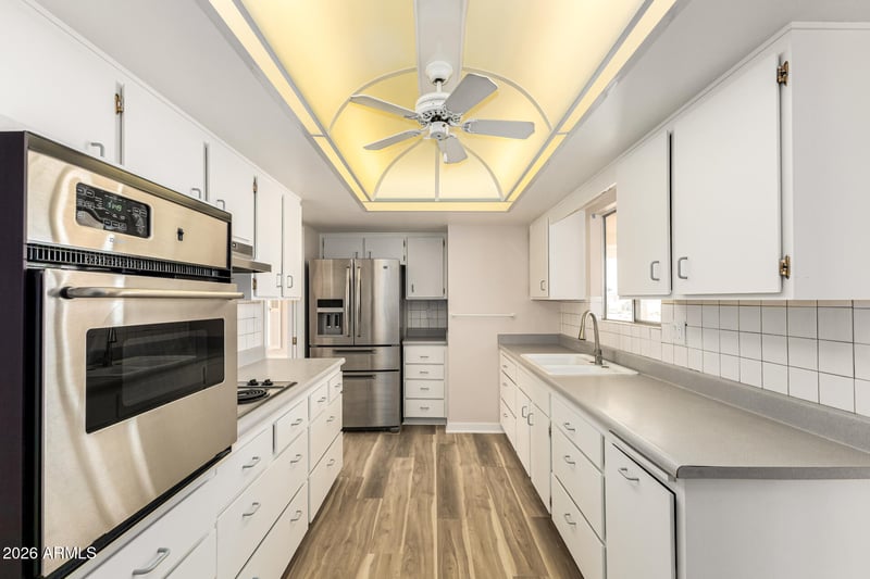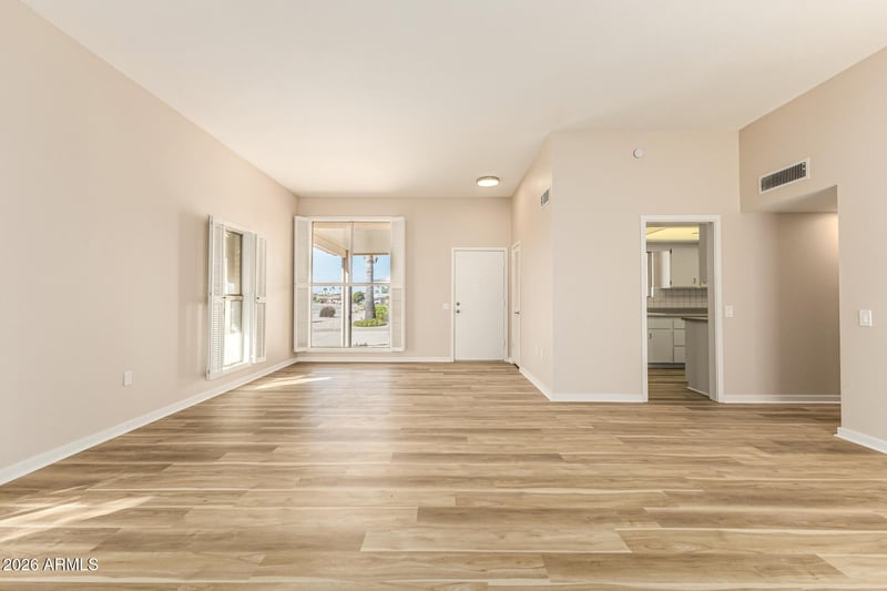 Listing details for 14443 Boswell Blvd, Sun, AZ 85351 : UPDATED Beautifully updated Sun City home featuring fresh interior and exterior paint, all-new flooring, and upgraded light fixtures that brighten every space. Enjoy peace of mind with a newer roof and HVAC blower unit. The functional floor plan features a large formal living and dining room, centrally placed kitchen with refrigerator included and spacious family room, perfect for everyday living or entertaining. The 2-car garage includes built-in cabinetry for extra storage, while the screened-in patio offers a relaxing spot to enjoy Arizona evenings. Outdoors, a brand-new drip system and refreshed landscape design add curb appeal and low-maintenance convenience. A move-in-ready gem in the heart of Sun City!