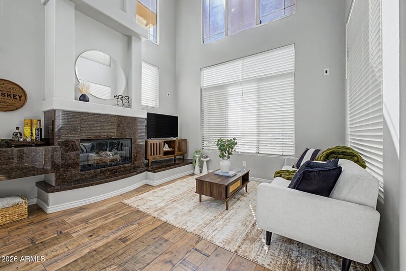 Listing details for 14450 Thompson Peak Pw #212, Scottsdale, AZ 85260 : Welcome to a stunning 2-bed, 2-bath townhouse nestled in one of North Scottsdale's sought-after gated communities. This home offers soaring 24-ft ceilings, floor-to-ceiling windows, and hardwood floors that elevate the open-concept floor plan. Enjoy cozy evenings by the gas fireplace or morning coffee on your private patio. The upgraded kitchen (2021) features granite counters, a gas range, and finishes perfect for entertaining or everyday ease. Upstairs, a spacious loft makes an ideal office or creative retreat. The primary suite boasts a walk-in closet, double vanities, and a garden tub added luxury. Whether you're seeking a lock-and-leave lifestyle or a stylish investment, this home blends comfort, convenience, and character in the heart of Scottsdale.