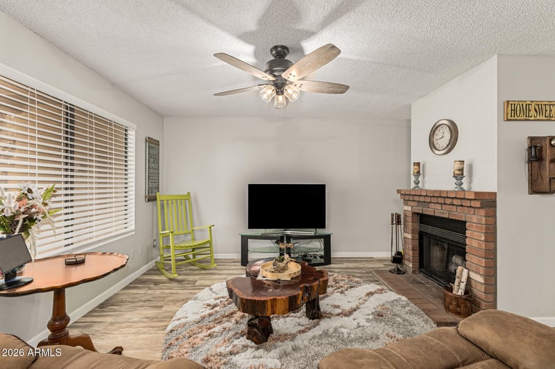 Listing details for 14461 58th Ave, Glendale, AZ 85306 : Enter to see an inviting living room featuring a brick-accented fireplace for cozy evenings. A convenient powder room w/vessel sink adds a touch of elegance for guests, while the dining area is filled w/natural light thanks to a charming bay window. The kitchen includes built-in appliances, sleek stone counters/backsplash, breakfast bar, & pantry. Upstairs, you'll find two main bedrooms! One has direct balcony access, walk-in closet, & spa-like ensuite w/dual sinks & separate tub/shower. The second main bedroom also offers its own bathroom w/dual sinks & walk-in closet! Outside, the charming backyard provides covered patio & lush grass. Plus, covered carport space & storage shed. Residents enjoy a pool, tennis courts, & walking paths. Stop by!