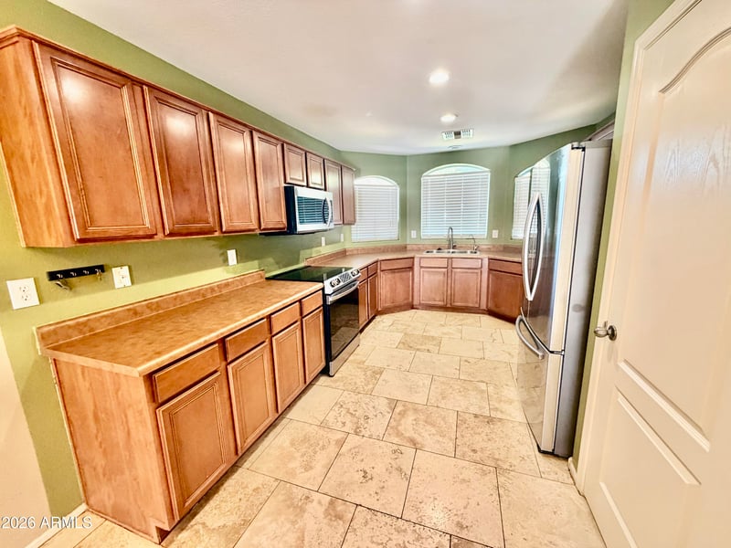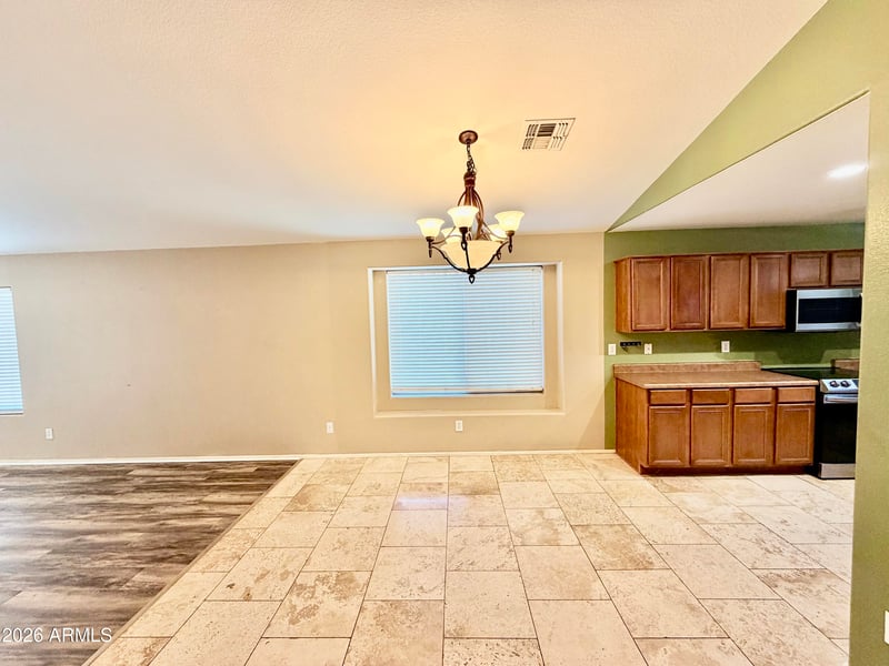 Welcome to this beautifully maintained home featuring a bright, open floor plan with a spacious family room seamlessly connected to the kitchen—perfect for everyday living and entertaining. Enjoy upgraded tile and wood-plank flooring throughout. The low-maintenance landscaping offers excellent curb appeal, while the large backyard provides plenty of space to relax or play. A covered patio is ideal for BBQs and enjoying Arizona's beautiful weather. Generously sized bedrooms with vaulted ceilings create an airy, open feel. Conveniently located near schools, shopping, medical facilities, and endless entertainment. Don't miss this opportunity!