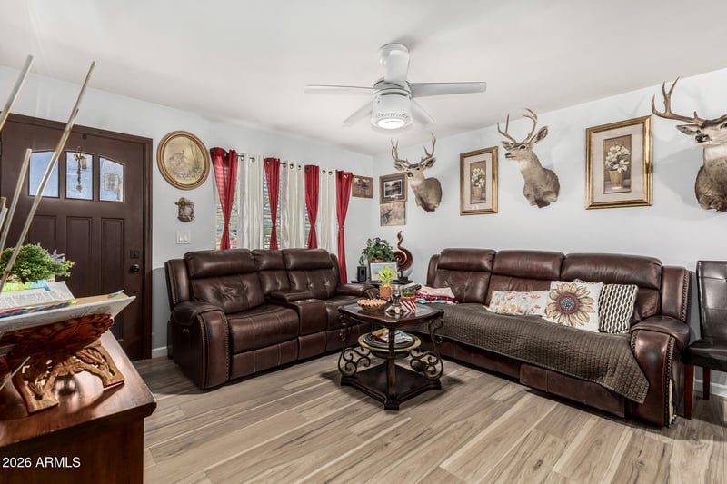 Listing details for 14502 1st Ave, El Mirage, AZ 85335 : Adorable single-story home with no HOA! Beautifully manicured and gated front patio. Inside, you'll find an inviting living room with wood-look flooring, plenty of natural light and neutral paint throughout. The well-appointed kitchen features white shaker cabinets, tile backsplash, quartz countertops, and built-in appliances for a seamless cooking experience. The backyard features an extended covered patio, perfect for morning coffee and weekend grills, as well as ample seating space, a grassy area, and RV gates. This home is a must-see!