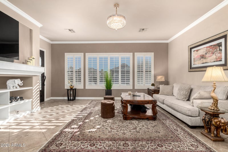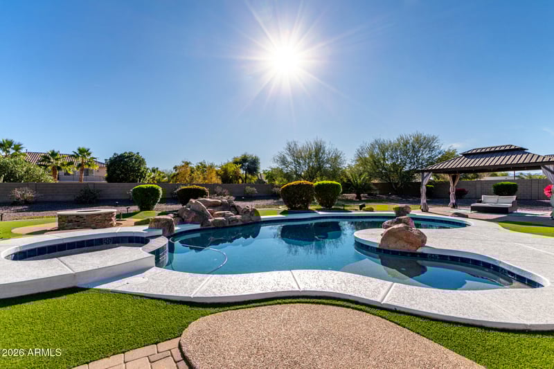Listing details for 14507 Christy Dr, Surprise, AZ 85379 : Experience the pinnacle of desert luxury in this stunning 4,255 sq.ft. residence in the prestigious gated community of Copper Canyon Ranch. Situated on nearly a full acre, this estate greets you with a circular drive, an inviting courtyard with misters, and custom metal double entry doors. The kitchen is a beautiful masterpiece, featuring oversized quartz island, a gas cooktop, beautiful pendant lights, exquisite touches, and a large walk-in pantry. This seamlessly opens into a massive great room with a cozy gas fireplace and direct access to the covered patio.