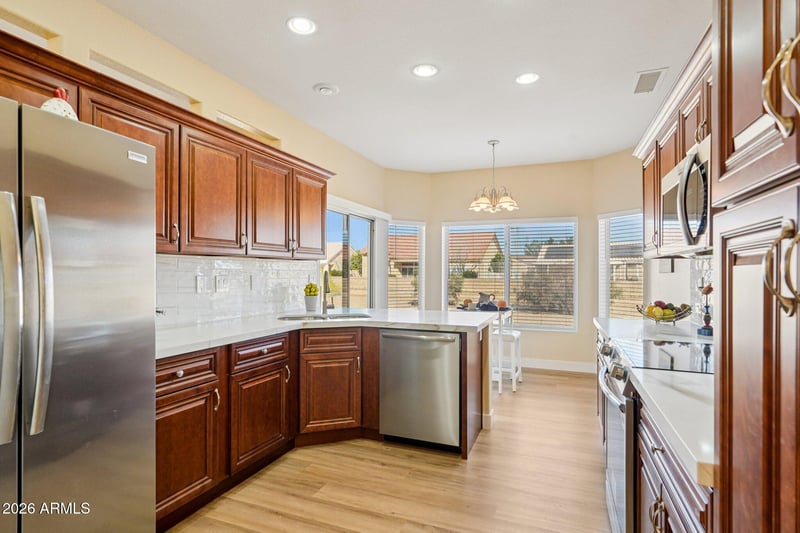 Listing details for 14520 Las Brizas Ln, Sun City West, AZ 85375 : Beautifully updated home includes new Kitchen w/ quality self closing cabinets, Quartz counter tops, tile backsplash, SS appliances, garbage disposal too! Large primary suite w/ new Cabinetry, Sinks, Tiled shower w/ glass doors, mirrors, lighting & toilet. PRIVATE TOILET. 2nd bath w/ tub. Luxury vinyl flooring in all areas except carpet in the bedrooms. Large closets. Eat in kitchen. Slider to the back covered patio. High Ceilings. High windows in both Bathrooms that bring in Natual light! North backyard w/ views of Mtns/no immediate neighbors, so pretty private. New 4.5'' baseboards & 2 tone paint. New stucco popouts , rock veneer & new 2 tone paint gives this home great curb appeal. Large extended garage w/ new epoxy painted floor & baseboards. New lighting & doors thruout YOO MANY UPGRADES to mention them all! Attention to detail in this remodel. New plants and Ficus Tree out front. Sun City West is an Active Adult Golf Retirement Community.