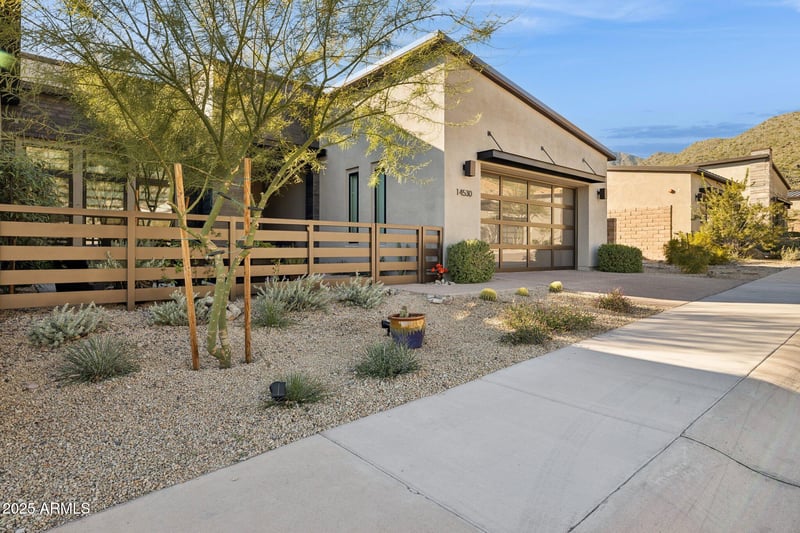 Listing details for 14530 Adero Canyon Dr, Fountain Hills, AZ 85268 : Spectacular elevated modern living at its finest with Views! Light and bright throughout with white cabinets. neutral palette throughout,1 level no steps. Designer finishes, chef's kitchen featuring quartz countertops, huge waterfall island,custom lighting and Wolf and Sub-Zero appliances with double ovens. High ceilings and expansive windows fill the home with natural light, while a 12' multi-slide door opens to seamless indoor-outdoor living with a spacious patio and sweeping views. A 72'' linear fireplace anchors the living area. Dual remote-controlled window treatments offer filtered or blackout light. The primary suite includes a freestanding soaking tub, walk-in shower, oversized closet, and north-side open space for added tranquility. Custom front Courtyard & so much more!