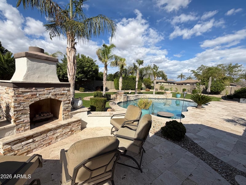 The luxurious primary bedroom showcases an ensuite with double vanities, a soaking tub, and a spacious custom walk-in closet. All bedrooms have their own ensuite privileges. Spend intimate moments with loved ones in the resort-style backyard, boasting a covered patio, travertine pavers, a lovely gazebo, an outdoor fireplace for evenings under the stars, a manicured lawn, great citrus tress and a sparkling pool for refreshing dips. This gem is a fantastic find! Make it yours before it's gone!