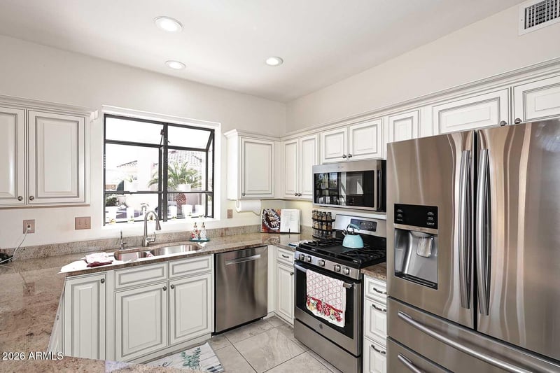 Listing details for 14660 Yosemite Dr, Sun City West, AZ 85375 : Don't miss the opportunity to own a rare home on an oversized, 18,700-square-foot lot--nearly half an acre--in a quiet cul-de-sac. This level of privacy and outdoor space is seldom available in the highly desirable resort community of Sun City West, especially with NO HOA! This spacious 2-bedroom, 2-bathroom residence features a beautifully renovated chef's kitchen, complete with an updated gas range, granite countertops, stainless steel appliances, and a garden window. The property also includes a large covered patio perfect for outdoor living and entertaining, as well as a two-car garage with built-in storage cabinets. As part of this community, you will have access to exceptional amenities, including 9 golf courses, resort pools, pickleball, walking trails, and over 100 different clubs