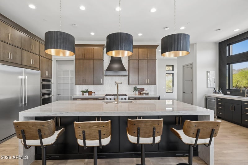 Listing details for 14729 Prairie Dog Trl, Fountain Hills, AZ 85268 : Experience refined contemporary Southwest living in gated Eagles Nest by Harr Family Homes. Nestled in the foothills of the McDowell Mountains, this stunning single-level residence captures sweeping views of Four Peaks and the Mazatzal Mountains. Designed for seamless indoor-outdoor living, the great room showcases a 12' x 10' glass wall and dramatic 60'' marble fireplace. The chef's kitchen features 10' modern cabinetry, full-size refrigerator and freezer, 138-bottle wine captain, and waterfall Quartzite expansive 10' island. Enjoy a cozy den with built-ins, and convenient wet bar. Offering 3 bedrooms, 3 baths, a den, plus a private casita and a rare 5-car garage. Luxurious primary suite with spa-inspired bath. Ideally located near Mayo Clinic, Scottsdale amenities, and scenic trails.