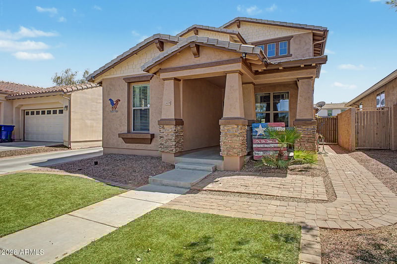 Listing details for 14779 Pershing St, Surprise, AZ 85379 : Welcome to this stunning two-story home in the highly desirable Marley Park community in Surprise! Offering 1,988 sq ft, this 4-bedroom, 2.5-bath home combines comfort, style, and functionality. Step inside to find a bright and open floor plan with soaring ceilings and abundant natural light. The spacious living area flows seamlessly into the beautifully appointed kitchen, featuring rich wood cabinetry, granite countertops, stainless steel appliances, a large island with sink, and stylish pendant lighting. Enjoy the charming curb appeal with a welcoming front porch, low-maintenance landscaping, and a long driveway for additional parking in addition to the 2 car garage. Located in the sought-after Marley Park community, residents enjoy tree-lined streets, parks, and walking paths.