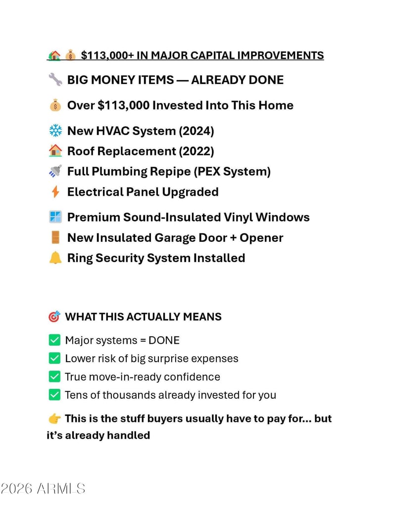 Listing details for 14819 Lamoille Dr, Surprise, AZ 85374 : Rare opportunity to own an extensively upgraded Kingswood Parke home with over $113,000 invested in MAJOR CAPITAL improvements, including new HVAC (2024), roof replacement (2022), full plumbing repipe, electrical panel upgrade, premium sound-insulated vinyl windows, and a fully remodeled kitchen.
