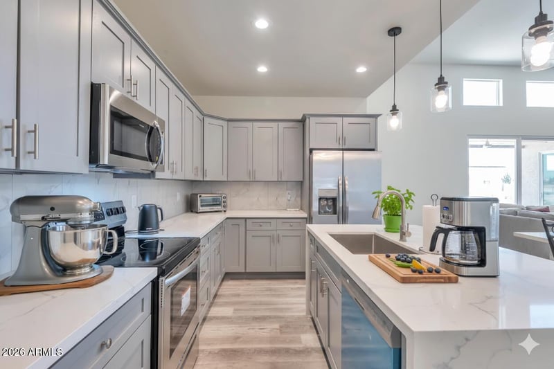 Listing details for 14825 Charco Rd, Arizona City, AZ 85123 : NEWLY COMPLETE CUSTOM HOME, never been occupied! Must see open concept design with 15 ft high ceilings in the living room and 8 ft high entry door. The kitchen contains soft close shaker cabinets, large waterfall kitchen island, quartz countertops, stainless steel appliances, & walk-in pantry. With 4 beds & 3 full baths, this home offers ample space for the family. Walk-in closets in every room, providing abundant storage and organization. Enjoy indoor-outdoor living & entertainment with 12 ft patio door and ceiling fans to cool off. Park your vehicles in the 8 ft garage. Stay comfortable year-round with ceiling fans in every room & cozy up by the fireplace in the living room. Tile plank flooring & upgraded window coverings add the perfect finishing touches.