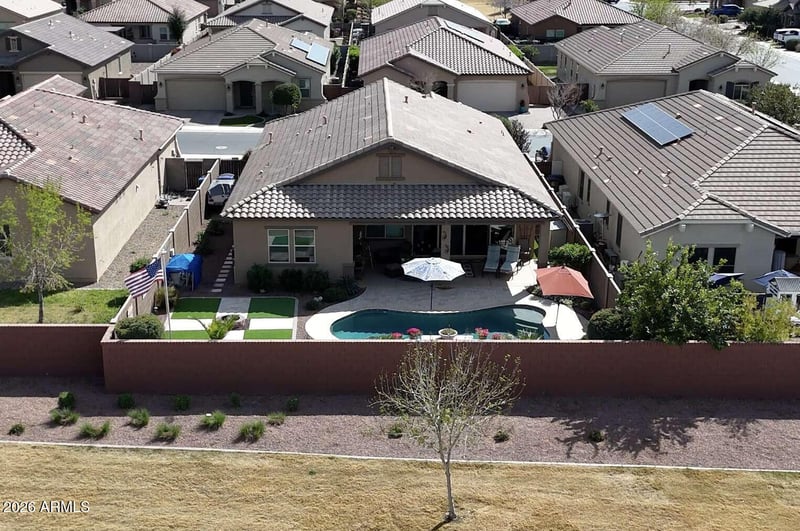 Listing details for 1484 Calabash Ave, Queen Creek, AZ 85140 : Welcome to this beautiful single level, model-like 4-bedroom, 3-full bath home located in the heart of Ironwood Crossing, one of Queen Creek's most desirable communities! This beautifully decorated pool home sits on a larger premium lot with no neighbors behind, backing onto a disc golf course allowing for a private backyard oasis. A Fulton Seaside model property! Thoughtfully designed and upgraded in all the right places, this home perfectly blends comfort, style, and value. From the moment you step inside, you'll be impressed by the attention to detail and the pride of ownership. The open and bright floor plan showcases gorgeous, upgraded porcelain wood plank tile, allowing for a seamless flow from room to room. This spacious layout features modern finishes, a security screen door, electric fireplace, elegant lighting, and a large kitchen equipped with oversized cabinetry, granite countertops, and a large island with seating for four--ideal for both everyday living and entertaining. The spacious primary suite offers a large walk-in closet, double sinks, a separate shower alongside an upgraded tub, creating a perfect blend of comfort and style. Sliding 16' atrium doors lead to a large pool surrounded by travertine, a covered patio, an outdoor sitting area, low-maintenance synthetic turf, a fire pit, and beautifully manicured landscaping. An RV gate with extended pavers further enhances the appeal of this exceptional residence.