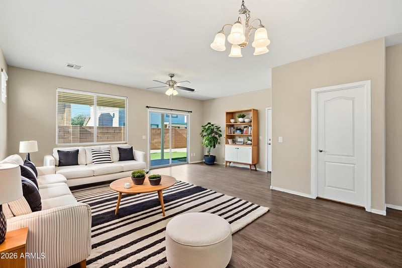 Listing details for 14906 174th Ln, Surprise, AZ 85388 : Spacious two-story home featuring 4 bedrooms and 2.5 bathrooms with an open floor plan ideal for everyday living and entertaining. The kitchen includes a convenient bar that opens to the main living area. The primary suite offers a spacious closet and double vanity. Enjoy a back porch overlooking a fenced backyard, plus a 2-car garage for added storage and convenience.