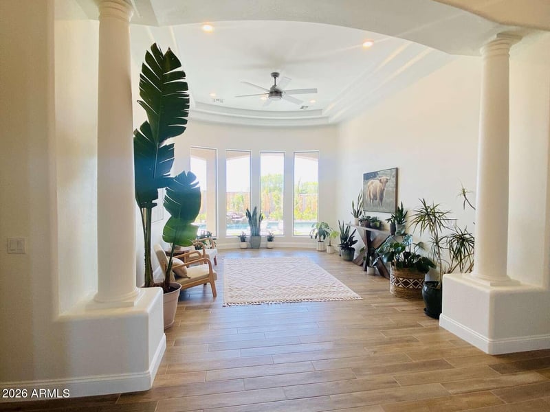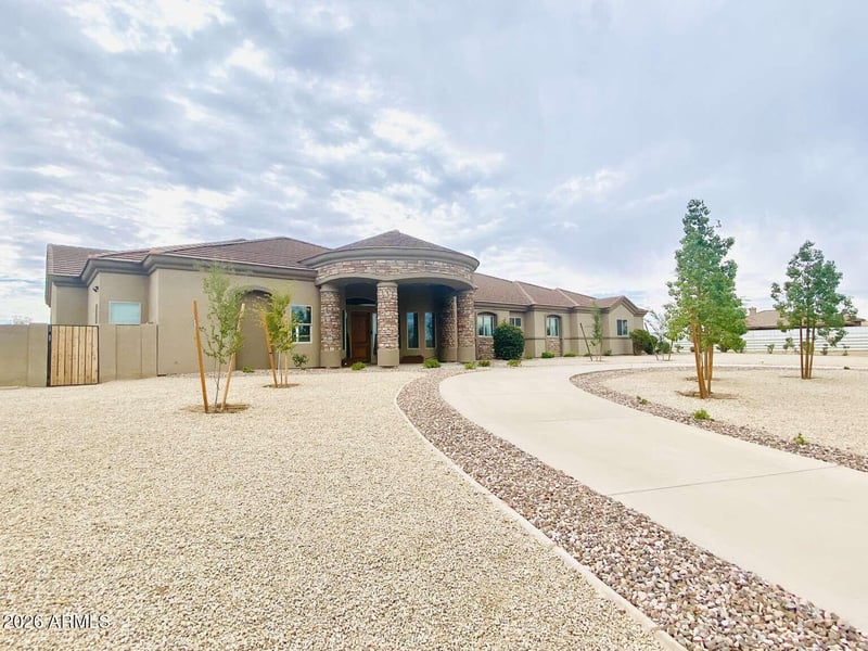 Listing details for 15 Lone Star Ln, San Tan Valley, AZ 85140 : Beautiful custom ranch home on 3.27 acres, NO HOA. Flood irrigation, covered horse stables, multiple turnouts, 10x20' barn with electricity, sparkling pebble-tec pool with waterfall. Fully remodeled home features 5 bedrooms 3 full bathrooms large laundry with quartz + extra storage. 36'' porcelain wood-look tile throughout! Gorgeous kitchen with sleek quartz countertops, waterfall island, Top of the line KitchenAid appliances, including induction range. Home has a spacious open feel with 12 ft ceilings & 8 ft doors, All NEW windows (2024), 4 car extended length garage with 9 ft garage doors. The covered back patio spans over 120 feet. on a private paved road with only 3 other custom homes. Enjoy direct access to QC wash for miles of trails right from your property. Enjoy direct access to QC wash for miles of trails right from your property. Enjoy the laidback country lifestyle, yet only minutes to shopping & restaurants!