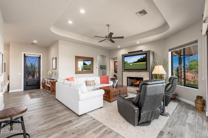 Listing details for 15021 Golden Eagle Blvd, Fountain Hills, AZ 85268 : Proudly introducing this stunning 2018 model home, perfectly positioned on a premium hillside lot! From soaring ceilings, designer finishes, & expansive windows, Arizona's natural beauty is captured from every angle. The open gourmet kitchen features high-end appliances, a walk-in pantry, & custom cabinetry, flowing seamlessly into elegant living and dining spaces. The spilt primary suite offers a spa-like bath, tile shower, custom closet & patio access. Enjoy breathtaking panoramic mountain views from your sparkling pool or spa that highlight the iconic Four Peaks. Whether hosting gatherings or enjoying a morning coffee, this backyard resort experience delivers a front-row seat to dramatic sunrises, vibrant sunsets, & the ever-changing mountain backdrop that defines luxury desert living.