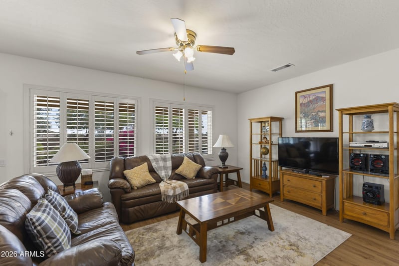 Listing details for 15027 Home Run Dr, Surprise, AZ 85374 : Awesome Azalea sold TURNKEY. This 2 bedroom, 2 bath home with den features numerous upgrades including maple cabinets, Bosch dishwasher and a new microwave (2023). Bay window in primary bedroom, ceiling fans throughout, plantation shutters, extended patio with premium patio roof, and a new garage door system (2023). Major improvements include windows (2012), water heater (2017), new flooring (2022), roof (2022), HVAC (2024), and exterior paint 2025. Private backyard. Ideal for seasonal living or as an excellent rental opportunity. Located in the highly sought-after community of The Grand which offers 65+ chartered clubs and interest groups, 22 pickleball courts, 11 tennis courts, 4 golf courses, 4 community pools, and so much more. A MUST SEE!