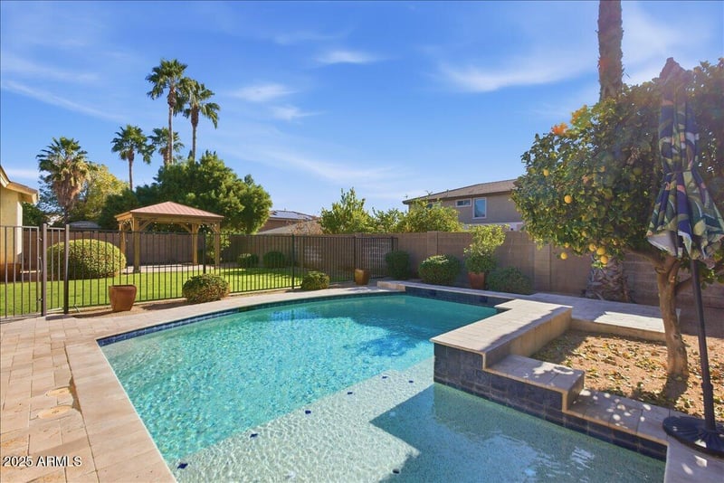 Listing details for 15115 Pierson St, Goodyear, AZ 85395 : This Gorgeous home features a beautiful interior as well as a resort style backyard retreat,3 car garage and RV gate. Popular open floor plan with Den.Enormous master bedroom and bath with double sinks, 2 walk-in closets and separate tub and shower. Generously sized 3 bedrooms and double sinks in the second bath.Kitchen offers new dishwasher, gas range and microwave, large island with granite countertops, breakfast bar, upgraded cabinets, large pantry and cozy breakfast nook.Enjoy beautiful, easy care hickory wood flooring and plantations shutters in all the right places. Relax and entertain in your backyard oasis. Recline on the extended patio or in the gazebo, refresh in the self cleaning pool and enjoy the grassy play area.Home is freshly painted and ready for you to make it yours!