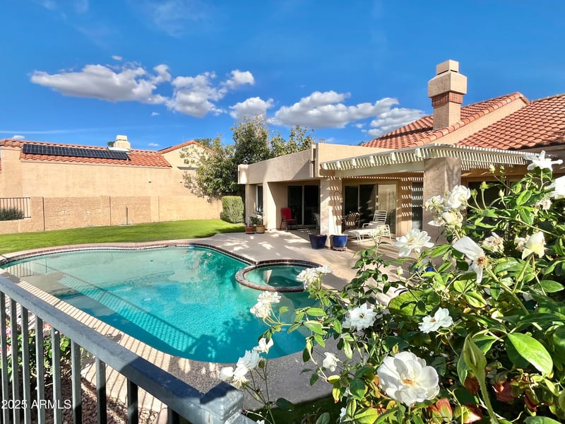 Listing details for 15136 86th Ln, Peoria, AZ 85381 : Beautiful GATED neighborhood! Access to Desert Harbor lakes + community pool. Soaring vaulted ceilings with brilliant natural light. Magnificent views to the FRESH WATER stream from the Living Room, Primary & kitchen dining, overlooking your own PRIVATE POOL & landscaped green lawn. Coated covered patio for relaxing. Fireplace to enjoy those cool evenings. Spacious primary & bath with an abundance of natural light, 2 sinks, separate tub & shower, & walk in closet. HOA takes care of all front landscaping including plants & artificial turf. Plenty of room to park with a 2 car garage and 2 spaces in front. Large den/office or turn into a 3rd bedroom! Probably never have to paint again with Rhino shield on the exterior! Near Rio Vista park & the paved16 mi New River Trail system