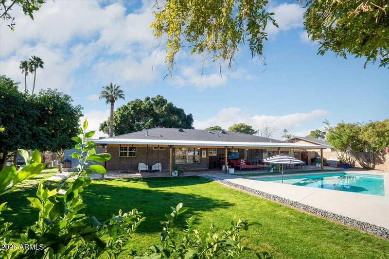 Listing details for 1516 Keim Dr, Phoenix, AZ 85014 : Excellent North Central mid-century ranch style home with tasteful updates and a timeless feel. Large cul-de-sac lot at dream cross-streets - a short walk out of the quiet neighborhood will take you to local favorite pubs and restaurants. Sandblasted slump block and modern-minimalist landscaping offer permanent curb appeal; while the back yard is flood irrigated with mature landscaping and a stylish pool. The interior features polished slab floors and original plaster details, while both bathrooms have been stylishly updated. The kitchen has been updated with white cabinetry and natural wood touches. Dining spaces are available in the living room as well as the back kitchen area, which also has an original work desk with beautiful built-in bookshelves. A covered patio runs across the entire back of the home offering 1100 square feet of covered outdoor living space, served by lighting & a misting system that will transfer with sale. Tucked out of sight in one side yard is a well built chicken coop. RV gate access is available from the front as well as the alley, and the west side yard is perfect for a 3rd vehicle, trailer or toy storage. A finished laundry room is accessibly via the garage and is fully lined with storage cabinets and a utility sink.