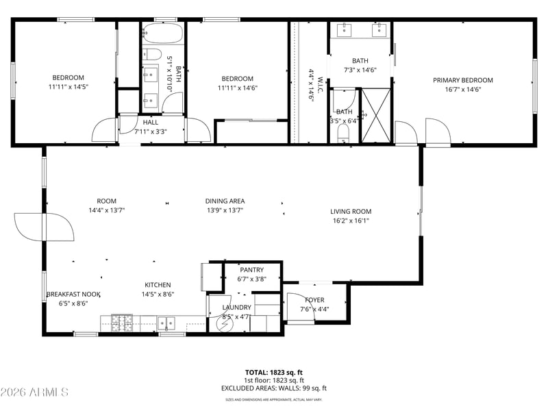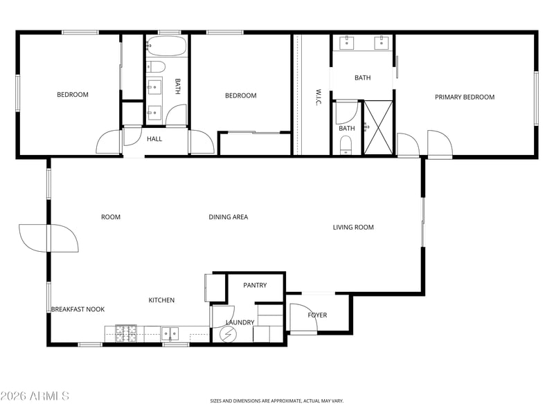 Step inside and you are immediately greeted by a large, modern, open-concept floor plan that feels airy, bright, and welcoming. Wood-look tile flows seamlessly throughout the entire home, anchoring the open great room and chef's kitchen in a cohesive, contemporary aesthetic. The split floor plan thoughtfully positions the primary suite on one side of the home, completely separate from the secondary bedrooms, offering privacy and quiet that is rarely found in a home of this age. Dual-pane windows and sliders throughout, custom blinds, and fresh, cheerful interior paint create an interior that is as functional as it is inviting.