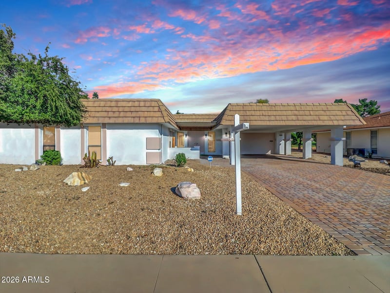 Listing details for 15213 Cameo Dr, Sun, AZ 85351 : 18th-hole stunner with VIEWS—walk to Palmbrook Clubhouse (~100 yards)! This upscale 3,018 SF home (665 SF new addition) brings major WOW with 3BD/4BA, porcelain flooring, and a new, oversized primary suite with spa-style bath (a standout in this community). Upgraded kitchen offers NEW stainless appliances, recessed lighting and breakfast bar. Big-ticket perks include PAID SOLAR, heated POOL + spa, plantation and roll shutters, paver drive/entry, plus a 2-car garage and large 2-car carport. Plus excellent storage throughout. The family room's wall of glass frames incredible golf and lake views. Outside, relax and enjoy your backyard oasis for Arizona living. Keep for yourself or leverage as a high-performing short-term RENTAL near shopping, dining and recreation.
