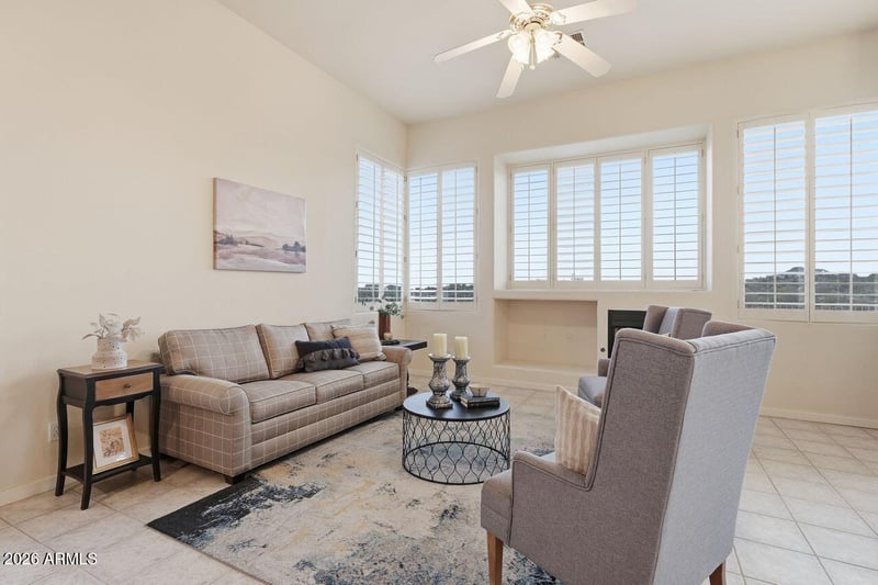 Listing details for 15219 Redrock Dr, Fountain Hills, AZ 85268 : Approximately 2,500 square foot one level home with two bedrooms plus an office with beautiful built-in wood bookshelves and desks and two and a half baths. The home features incredible mountain and city light views with a north-south exposure. The property is located in a gated hillside community and boasts an open, split floor plan that is light and bright throughout. This home has a formal living room and dining area plus a family room with a gas fireplace. The eat-in kitchen includes a breakfast bar with newer stainless steel appliances, double ovens, and a gas stovetop. Natural light is abundant and stay cooled by the newer dual-zoned air conditioning systems. The large primary bedroom with sitting area features a huge primary bathroom with a separate tub and shower. Also included is the walk in closet w/safe. Spacious guest bedroom and guest bath plus a powder room. Plantation shutters and high ceilings are throughout. This home also has a gas furnace and a built-in firepit in the large maintenance free backyard. Two-car garage has built-in storage cabinets and the roof and AC's are newer. This is it and it has it all!!