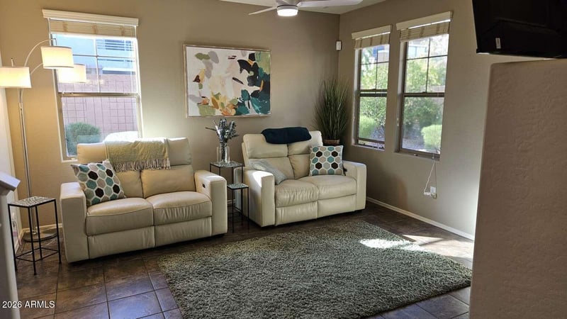Listing details for 15240 142nd Ave #1170, Surprise, AZ 85379 : Beautiful 3 bed, 3 bath Town home located in the gated community of Town Square Sierra Verde! Best location in the back of the neighborhood, this unit offers maximum preferred. Open and spacious floor plan with high ceilings, neutral colors, updated lighting and plumbing fixtures & plantation style window treatments. The wonderful kitchen offers solid wood cabinetry, kitchen island, SS GE Profile appliances, a breakfast bar & walk in pantry. The primary bedroom features an en-suite bath with dual sinks, & a walk-in closet. Main floor bedroom / office / media room has its own walk in closet! Enjoy your evenings in the partially covered patio. Attached garage with extra storage & security system. There is a sparkling blue community pool, hot tub and exercise room. Perfect location near shopping and an easy commute to just about anywhere! Enjoy low maintenance Town home living in a gated community.