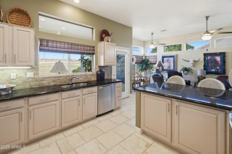 Listing details for 15244 Las Brizas Ln, Sun City West, AZ 85375 : This beautiful 2 bed 2.5 bath Pinetop model is on the 17th hole of Desert Trails Golf Course and in a Cul-De-Sac. The backyard oasis has a heated pool and spa by Shasta Pool. Seller is updating the pool in Feb 2026 with new tile, new pool lights and new cool decking. The home features designer window covering and crown molding throughout the home, sellers added main entrance and gate, engineered hardwood in bedrooms, den and living and dining rooms. Light fixtures replaced, GE stove, oven, microwave and dishwasher. Granite countertops with brick backsplash. PVC irrigation just added, 2023 new pool pump, 2021 new water heater, 2020 new roof underlayment, 2020 exterior of home painted, 2017 travertine tile in family room, kitchen, main bath, guest bath, and hobby room.