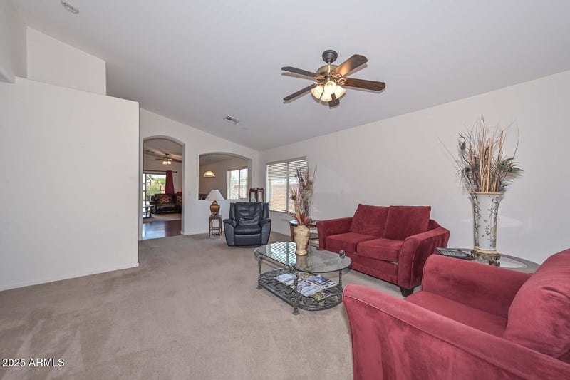 This beautifully landscaped single-level gem welcomes you with a shaded front porch and expansive living spaces perfect for gatherings. The modern kitchen boasts sleek white appliances and seamlessly flows into a generous dining area and cozy family room. Step out to the covered patio overlooking a grand backyard—ideal for play, entertaining, or adding your dream pool. The thoughtful layout includes two spacious guest bedrooms, a convenient hall bath, and a private primary suite with walk-in closet and en suite bathroom. Prime location with access to fantastic Sundance Park (playgrounds, splash pad, fishing lake, sports fields) plus Buckeye's hiking trails, golf courses, and nearby Skyline Regional Park. Embrace.