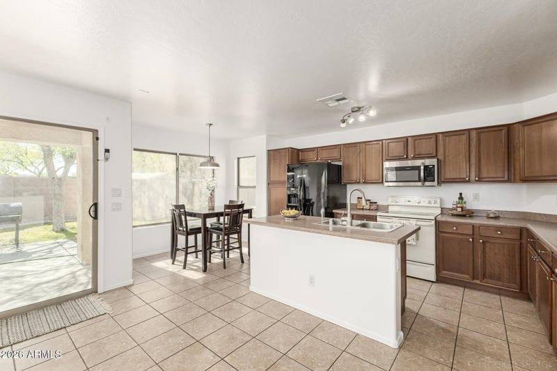 Listing details for 15286 Smokey Dr, Surprise, AZ 85374 : Amazing 4-bedroom, 2-bath home situated on an oversized corner lot with a sparkling pool! From the moment you arrive, you'll love the charming covered front walkway with space for a cozy sitting area. Step inside to a freshly repainted interior, completed from floor to ceiling, offering a clean feel throughout. The spacious family room flows seamlessly into the kitchen, creating the perfect space for everyday living and entertaining. The kitchen features rich cherry cabinets, an island with a built-in sink, and abundant storage. Enjoy both a breakfast nook and a separate dining area for added flexibility. The primary suite is thoughtfully designed with a walk-in closet offering ample storage, along with an en-suite bathroom and shower. The additional three bedrooms are generously sized, and the hallway bathroom includes a convenient bathtub. The backyard is truly an entertainer's dream! This oversized lot offers a large grassy area--perfect for kids, pets, or gatherings--along with a beautifully maintained and gated pebble tech pool with newly painted pool deck, ideal for those hot Arizona summers. Additional highlights include a new roof and AC, providing peace of mind for years to come. This home has it all--space, upgrades, and a fantastic outdoor setup. Don't miss out!