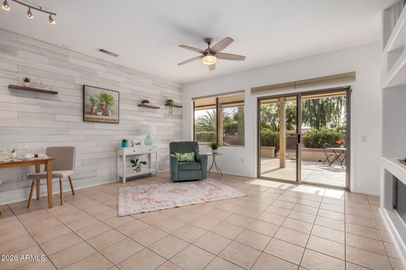Listing details for 15303 Kidneywood Ln, Surprise, AZ 85374 : Beautifully updated 1,427 SF Cactus Flower in The Grand 45+ Community! Newer TRANE HVAC & water heater (2019) plus front & rear PVC irrigation (2020). Spacious great room features a custom slat wall with floating shelves and a custom media wall with lighted niches. Updated kitchen offers beveled-edge granite countertops, KitchenAid stainless steel appliances, newer 4-door refrigerator and a custom banquette for cozy dining! Primary suite includes bay window & dual closets. Primary bath w/granite C-top, dual sinks. Updated shower features designer tile to the ceiling, rain glass enclosure & TOTO commode. Guest bath updated w/subway tile to ceiling, newer vanity, & TOTO commode. Interior freshly repainted. Rear yard showcases extended pergola & cool decking patio! Unobstructed sunset views! Additional features include neutral tile throughout, motorized sun shades on the rear patio, a front screen door, cool decking along the front walkway, and a utility sink in the garage. A convenient service door provides access to the side and rear yard.